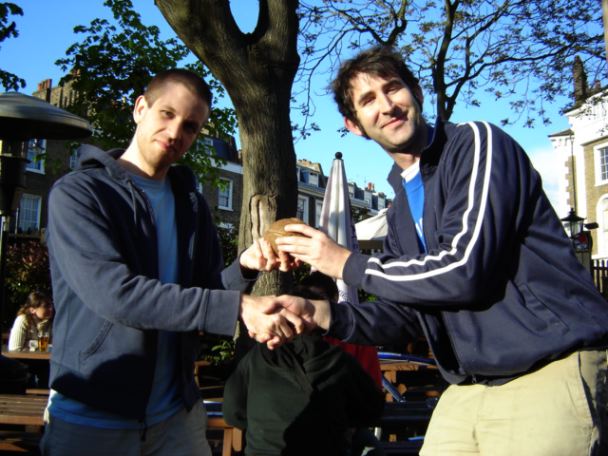 On Sunday 8th May 2005 the club held the 3rd Spring Coconut. It was decided that a later start time would be more convenient all round and despite some brief showers and windy spells the players were rewarded with a fine afternoon. The course was looking beautiful in the Spring sunshine in full blossom and was generally firm underfoot. Human obstacles were only encountered at the fourth with two young men enjoying an evening beer being flummoxed by the approaching frisbees. Oh, and some rude softballers once again. Ten players - including 7 rookies - chose their discs at the first tee and we went off in two groups. Despite group two getting lost at the 7th, we played from 5.30 until 6.45 when we repaired to the Edinboro Castle for a round of drinks, some table football and then a trip to Wagamamas. Ben broke his course record and retained the Men's Coconut. Jane W kept her hold on the Ladies' title and won her Second Spring Coconut. Both used Aerobies. The standard was very high this season and it's hoped that many of our new members will return for the Summer Watermelon. See you in July!